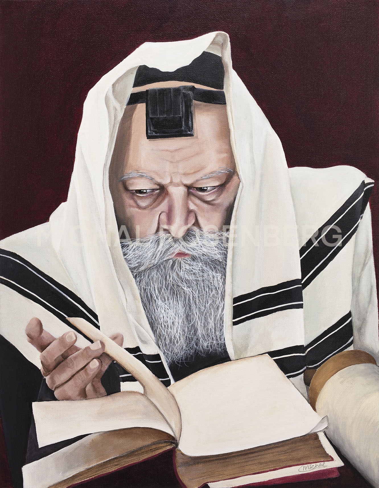 In this realistic portrait, the Rebbe is depicted with intensity, immersed in study and contemplation. His countenance is marked by wisdom and humility, his eyes alight with the intensity of thought and spiritual insight. His tallis drapes gently over his head, a symbol of his devotion to prayer and connection with the Divine. As he sits in study, the Rebbe's hands move with purpose and precision, turning pages and delving deep into the wisdom of the ages. Through this realistic portrayal, the painting captures the essence of the Rebbe as a scholar, teacher, and spiritual leader, inviting viewers to contemplate the profound beauty and depth of Jewish learning and tradition.